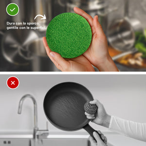 Un lato abrasivo in poliestere riciclato, con tecnologia al carbonio, per rimuovere lo sporco ostinato